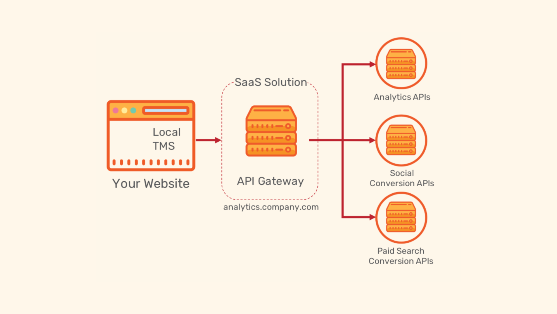 This set-up eliminates the dependency on cookies to send conversions to marketing tools. Therefore cookie_IDs can’t be used as identifier. This solution requires the availability of alternative user identifiers. Also, it offers control over which data is shared with the endpoints.
